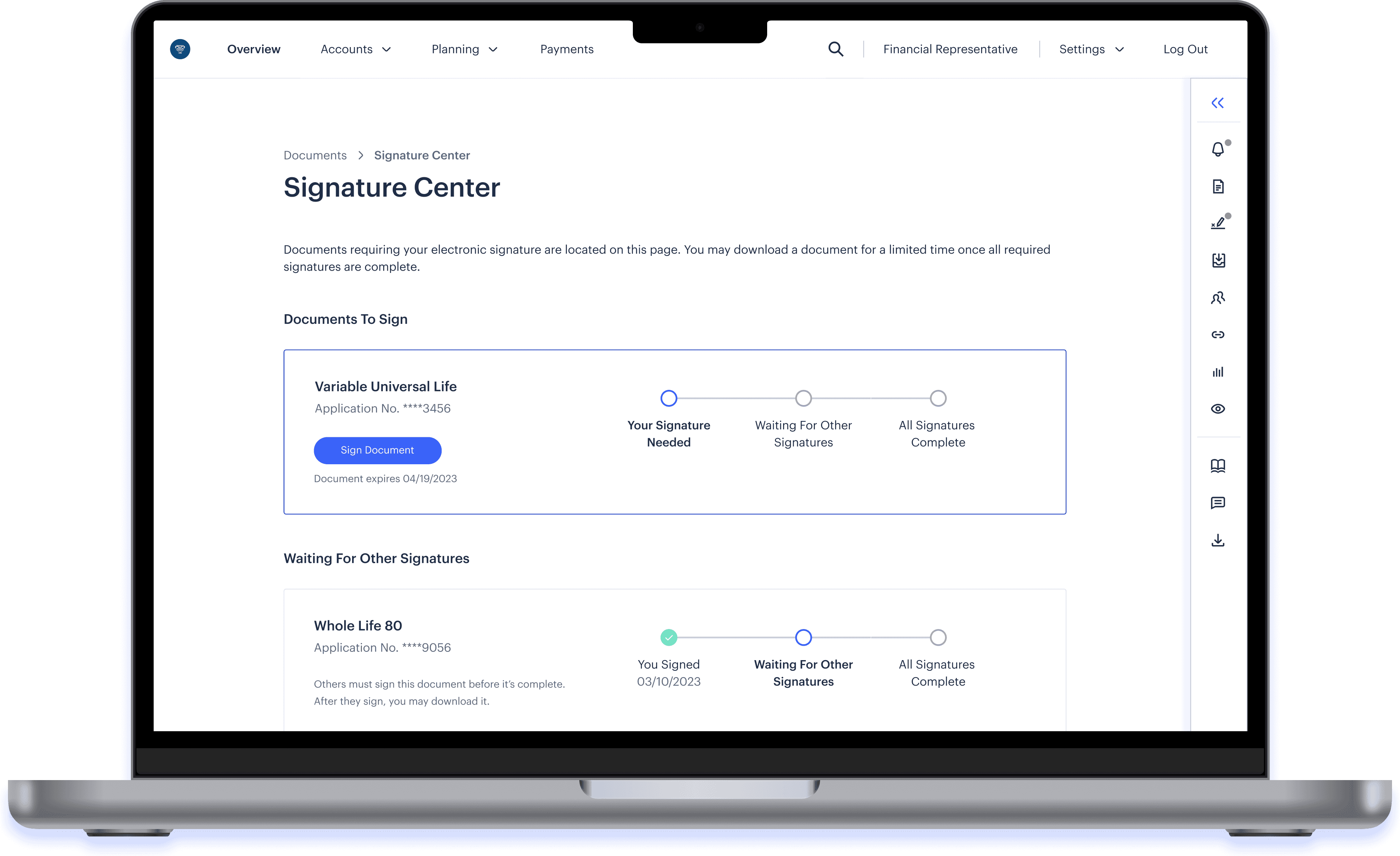Northwestern Mutual (NM) clients are regularly asked by their Financial Representative (FR) to sign multiple digital documents at a time. However, the current eSignature experience is not optimized for either parties. In the case of the client, all document requests are sent in individual emails with no way to track or confirm the status of one’s documents.